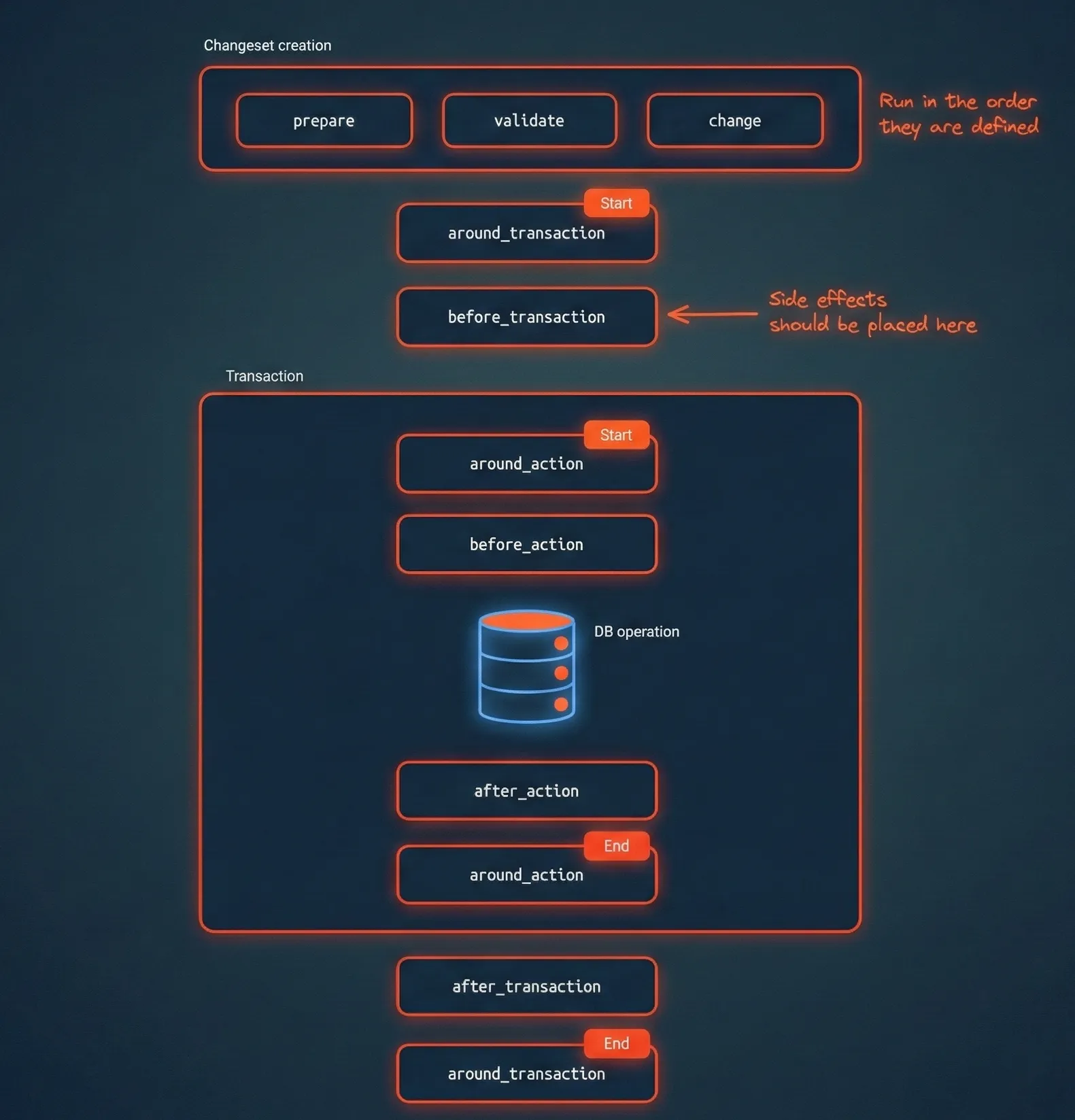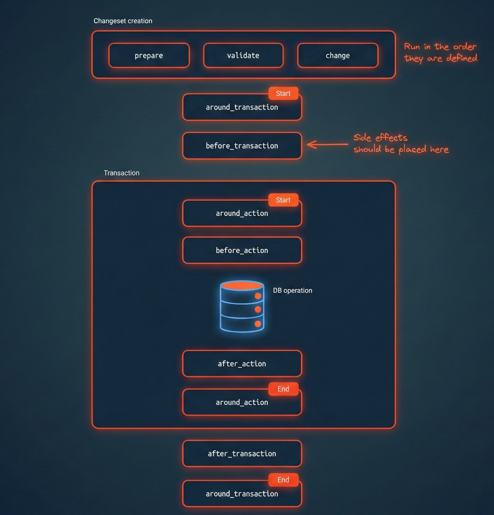 The diagram above illustrates the complete flow from changeset creation through to the final transaction cleanup. Notice the clear boundaries: changeset creation and before_transaction sit outside the transaction block, whilst before_action, the database operation, and after_action all occur within the transactional boundary.