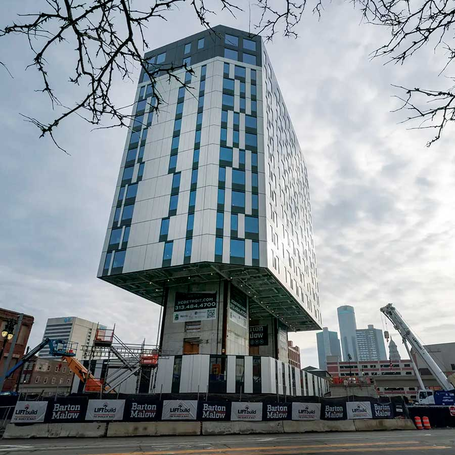 First they build the structural spine of the building. Then each floor is assembled on the ground out of prefabricated components. When completed, the entire floor is lifted into place with jacks. They start building at the top floor and then work down to the ground. Working on the ground has all kinds of benefits, from speed, cost reduction and worker safety.